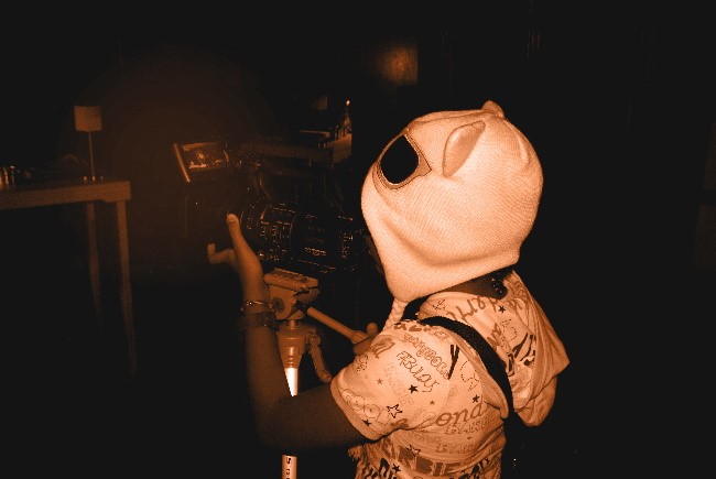 A veces él me encarga de hacer de portavoz entre los camarógrafos, si por eventualidad necesitan algo, come cambiar el casete o simplemente si tienen sed y necesitan tomar. Es divertido. Uno se siente parte de un proyecto que mescla acción, arte y paciencia. La paciencia es necesaria para hacer algo, una y otra vez o porque hay que esperar varios minutos sin hacer nada y luego en pocos segundos hacer montones de cosas.