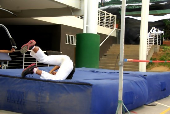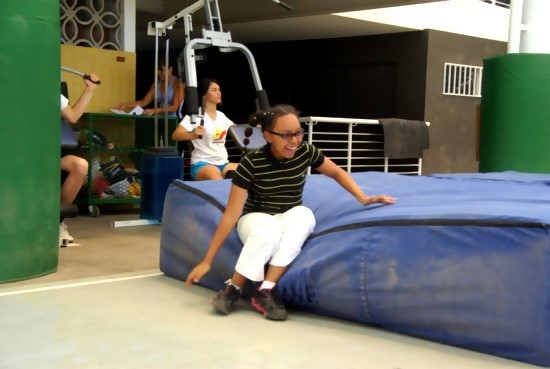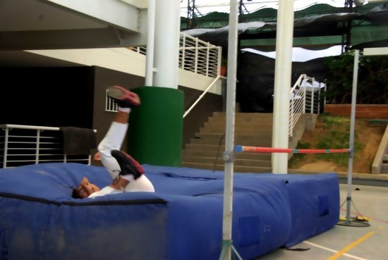 Aterrizaje en el colchón de manera suelta y con pirueta mostrando el lado B.