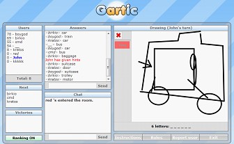 Los jugadores pueden escoger una room como en la chat y iniciar a jugar con las personas ya online. Se trata de adivinar los diseños que turnándose se va a dibujar por medio de un sencillo editor grafico similar a Paint.