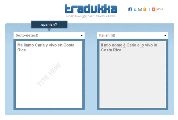 Solamente se escribe un testo en el apósito campo y tradukka es en grado de reconocer el idioma. En el otro campo se escoge el idioma en el cual se quiere traducir.